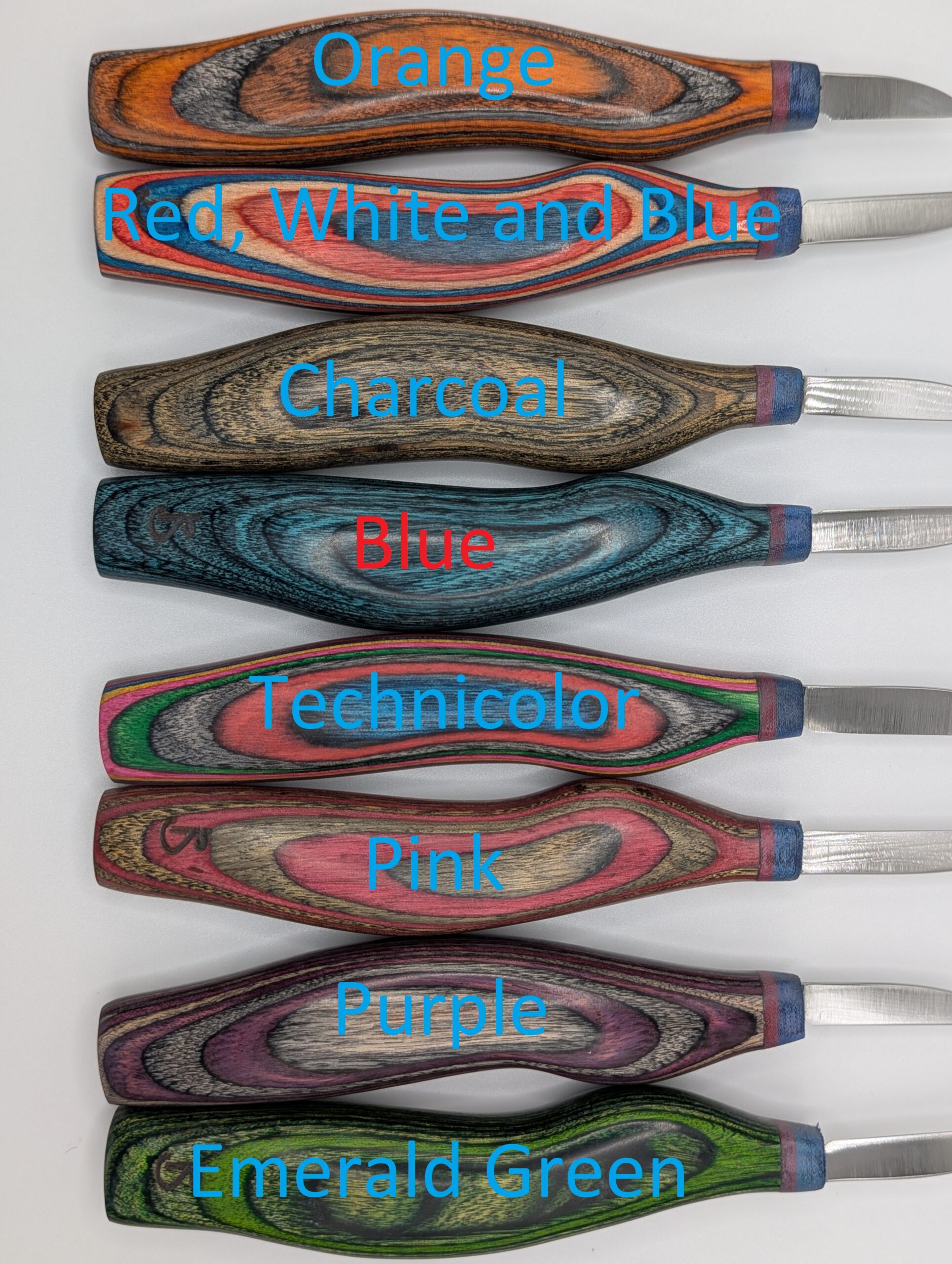 Special edition “Dymalux” handle Silvern Wood Carving Knives are made using O1 tool steel and “micarta”-style bolsters for extra stability. The heat treatment is done in-house, resulting in Rockwell hardness of 60-62. The knives are 1/16″ thick and vary in length and width depending on the style. All knives are ground flat with a slightly convex secondary bevel that you can customize to your preference. All handles measure 5″ in length and around 3/4″ in thickness.